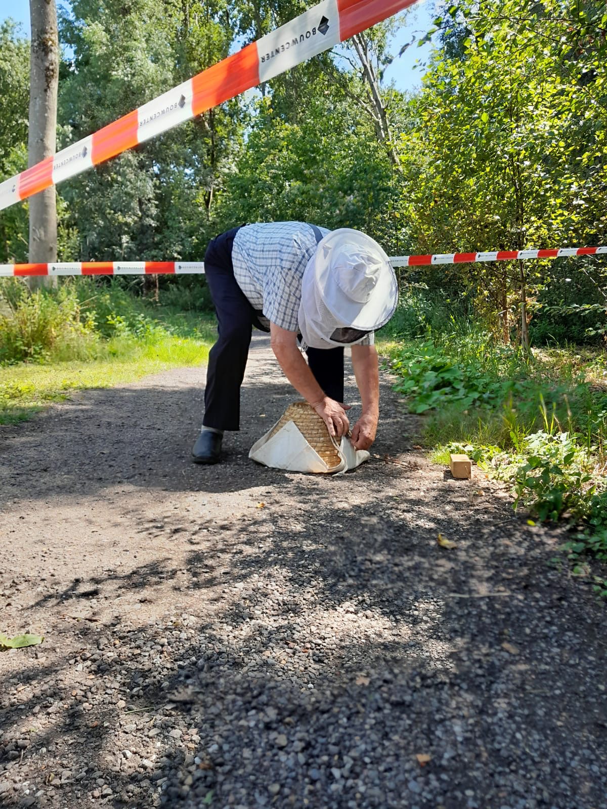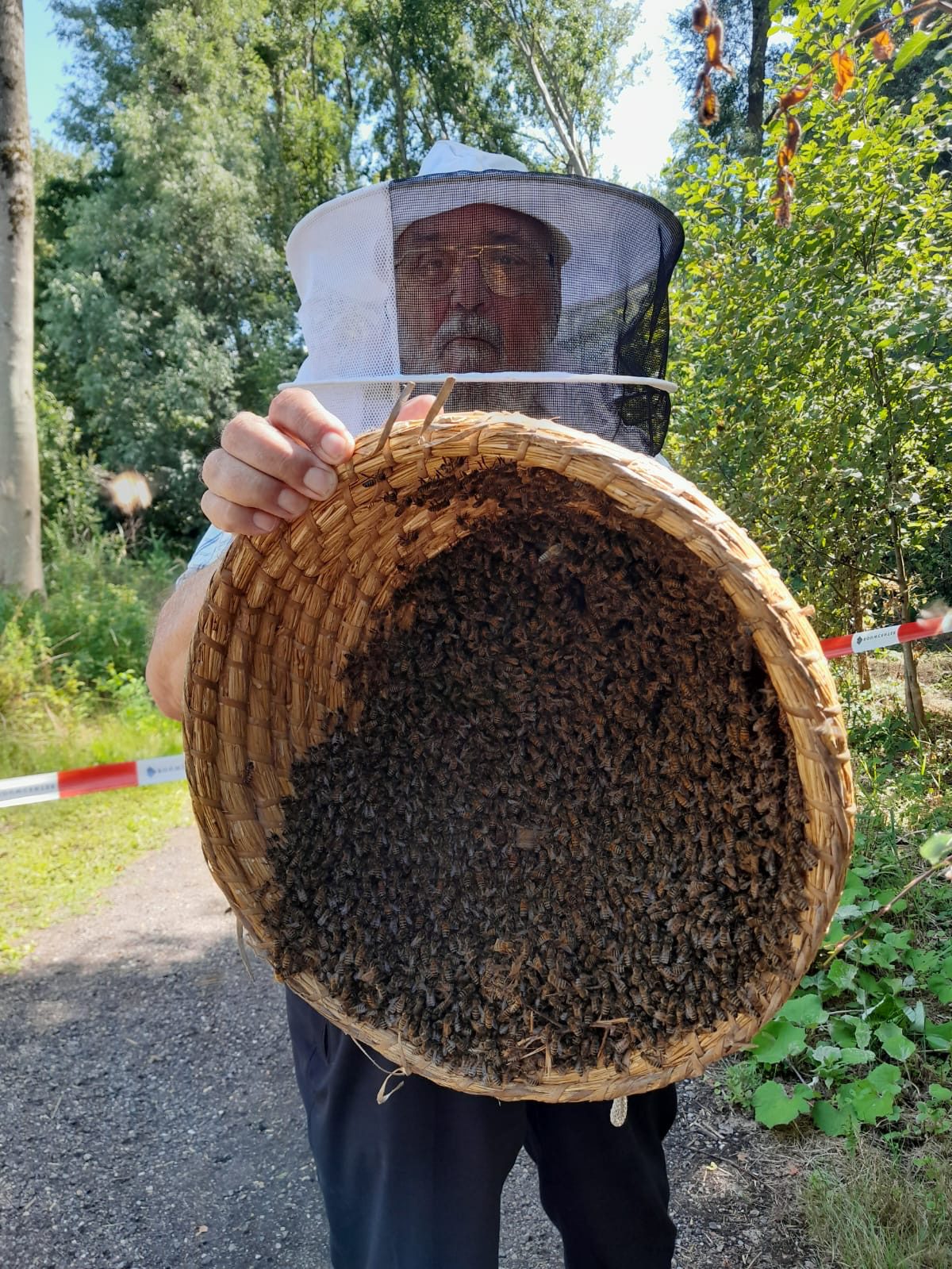 Inmiddels is de imker langsgekomen om de zwerm af te scheppen en aan een nieuw onderkomen te helpen. Zo gaan we van één naar twee volken.
